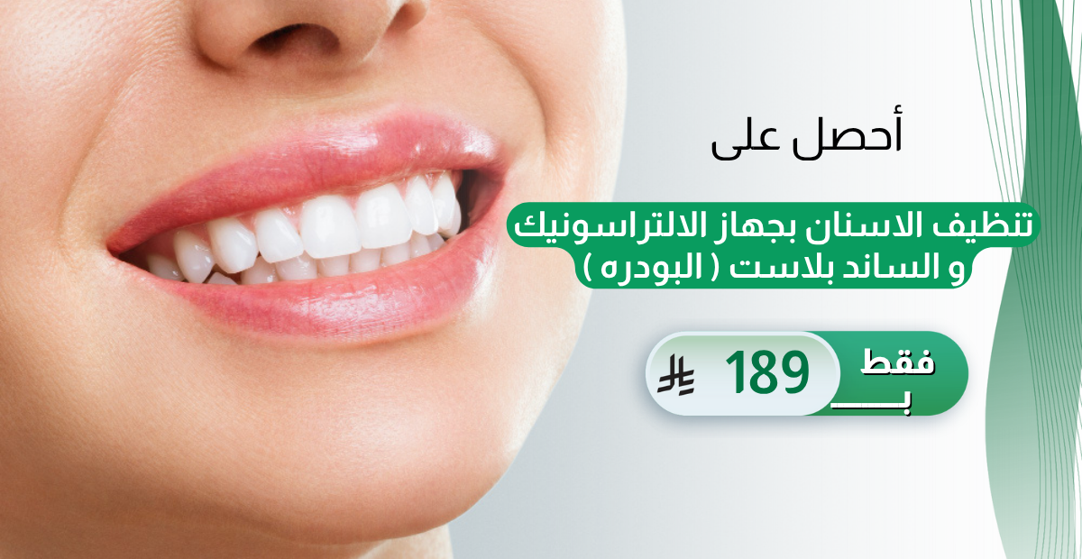 تنظيف الاسنان بجهاز الالتراسونيك و الساند بلاست ( البودره ) تشمل : تنظيف الاسنان , ازالة الرواسب الجيرية + تلميع الأسنان , + الكشف مجاناً لتشخيص مشاكل الاسنان (تسوسات - حشوات - علاج عصب - ابتسامة هوليودوغيرها ..) يشمل من لديهم تركيبات او تقويم