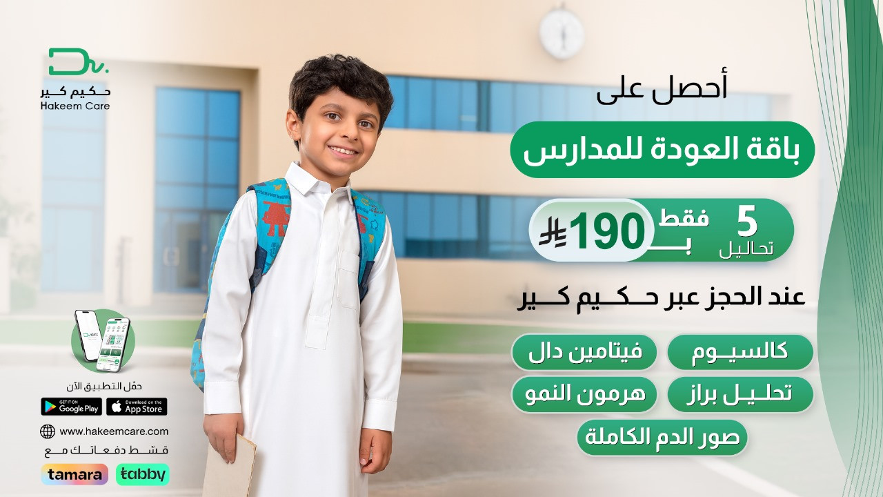 باقة العودة للمدارس ( 5 تحاليل ) تشمل : - تحليل صور الدم الكاملة - تحليل الكالسيوم - D تحليل فيتامين - تحليل البراز - تحليل هرمون النمو
