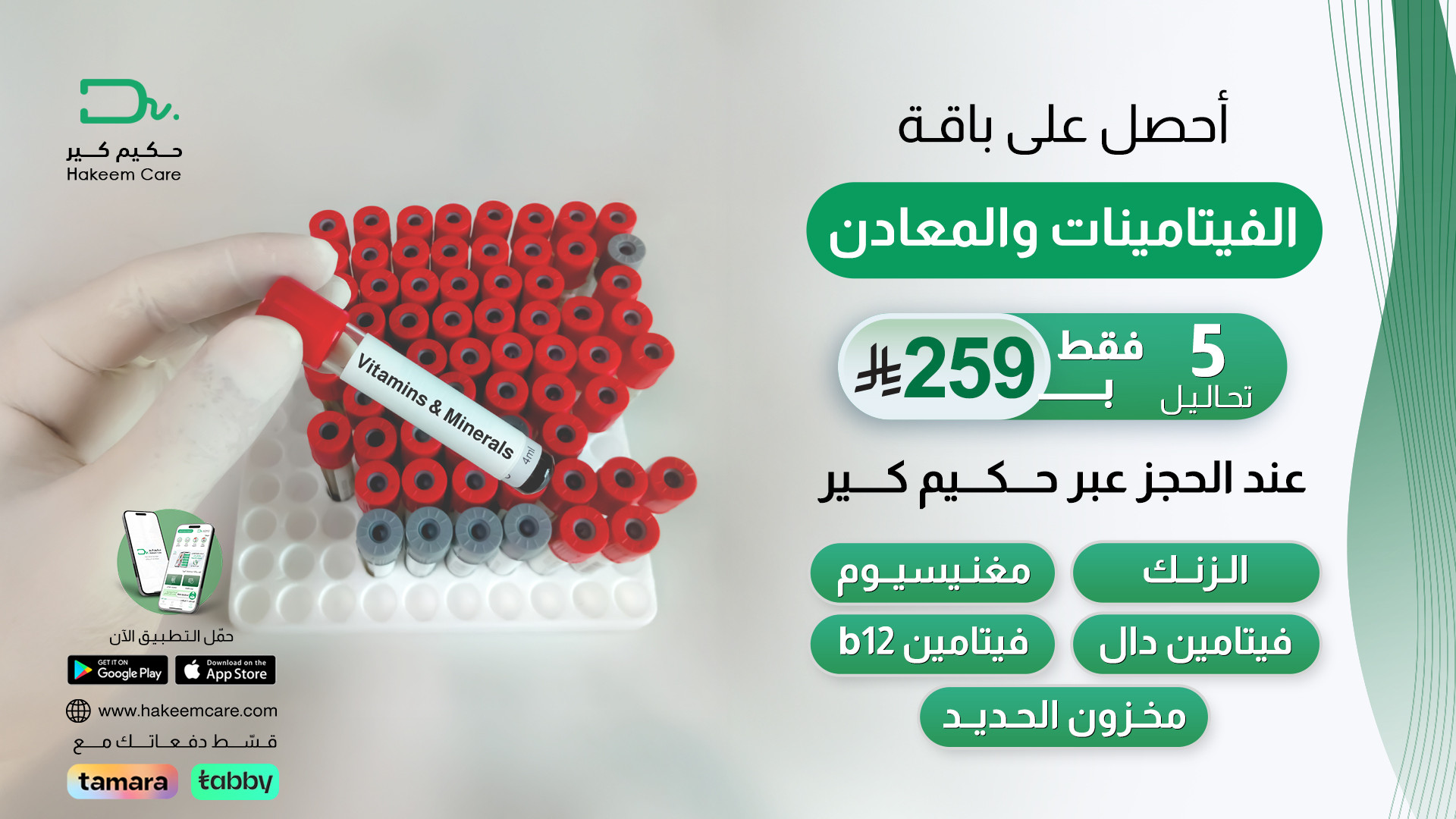 باقة الفيتامينات والمعادن ( 5 تحاليل ) تشمل : - تحليل الزنك - تحليل المغنيسيوم - تحليل فيتامين D - تحليل فيتامين B12 - تحليل مخزون الحديد