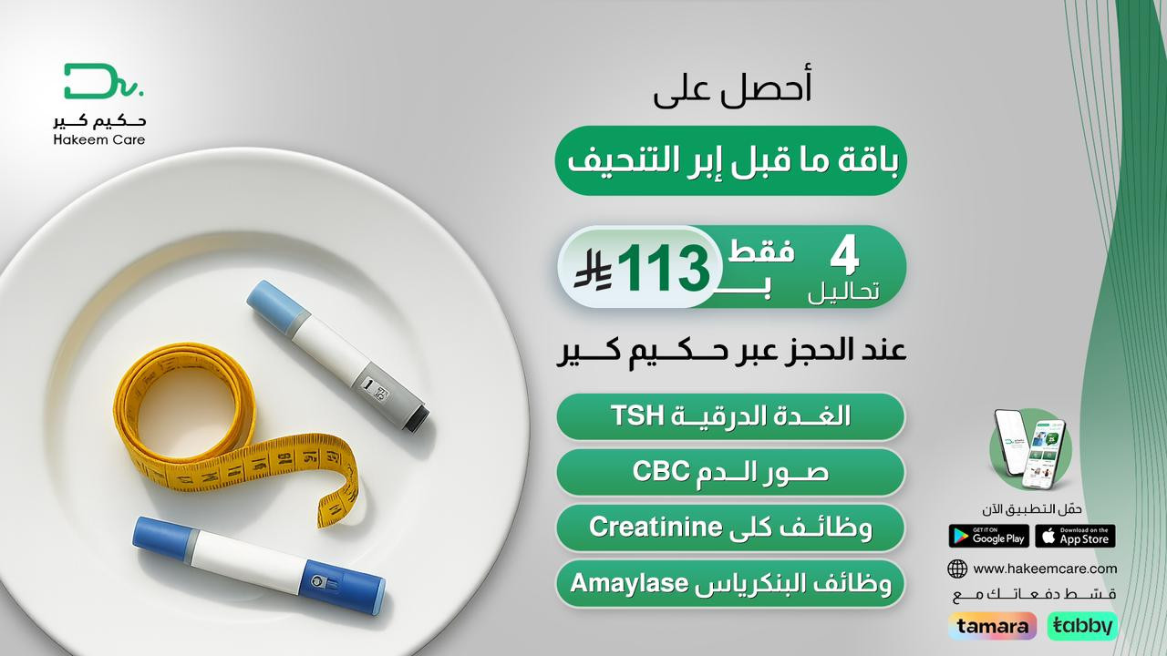 باقة ما قبل ابر التنحيف ( 4 تحاليل ) تشمل : - تحليل الغدة الدرقية TSH - تحليل صورة الدم CBC - تحليل وظائف الكلى Creatinine - وظائف البنكرياس Amaylase