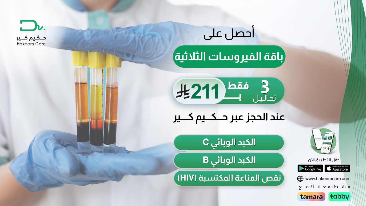 باقة الفيروسات الثلاثية ( 3 تحاليل ) تشمل : - تحليل الكبد الوبائي C - تحليل الكبد الوبائي B - نقص المناعة المكتسبة HIV