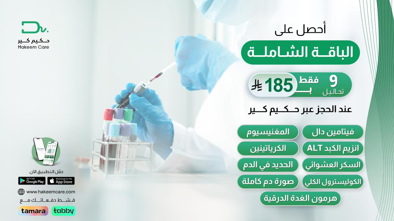 باقة تحاليل شاملة ( 9 تحاليل ) + 90 ريال رسوم الزيارة المنزلية تشمل :